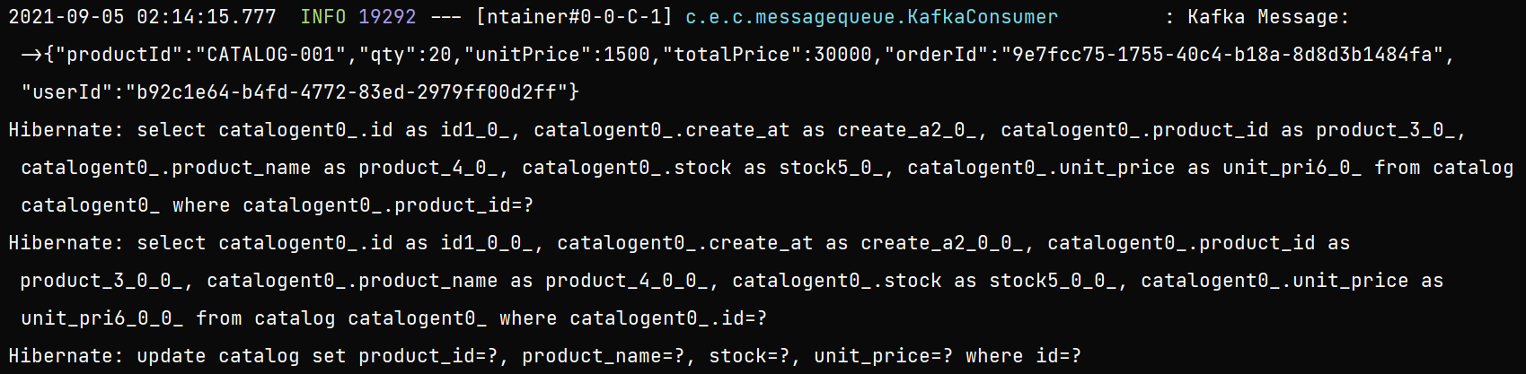 - Catalogs Service에서 Kafka Topic에 전송 된 메시지 취득 -> Consumer