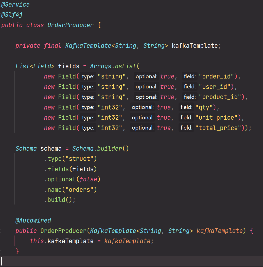 - Orders Service의 Producer에서 발생하기 위한 메시지 등록(데이터 포맷을 지켜야함)