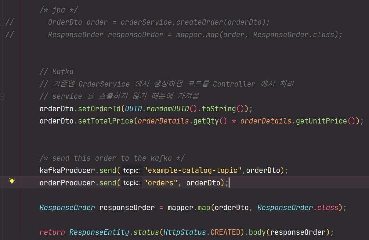 - Orders Service에서 Kafka Topic으로 메시지 전송 -> Producer